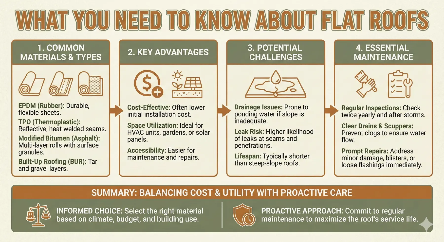 A flat roof is a roofing structure with a slope of 10 degrees or less. Commonly used in commercial buildings, multi-family units, and modern homes, flat roof systems offer several practical advantages: