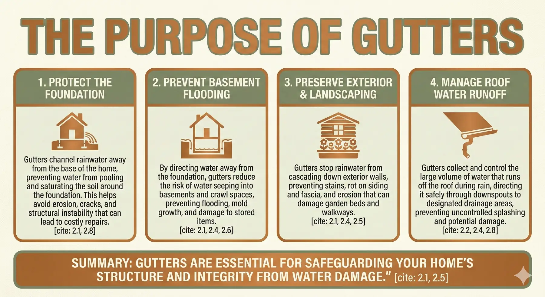 Middle Tennessee averages around 54 inches of rain annually, making a durable and effective gutter system essential for local properties (U.S. Climate Data). Without proper drainage, rainwater can damage your roof, siding, fascia, foundation, and landscaping. Clogged or broken gutters can lead to basement flooding, soil erosion, and wood rot, issues that cost thousands to fix. Gutters channel water away from your home to prevent structural issues and protect your investment.