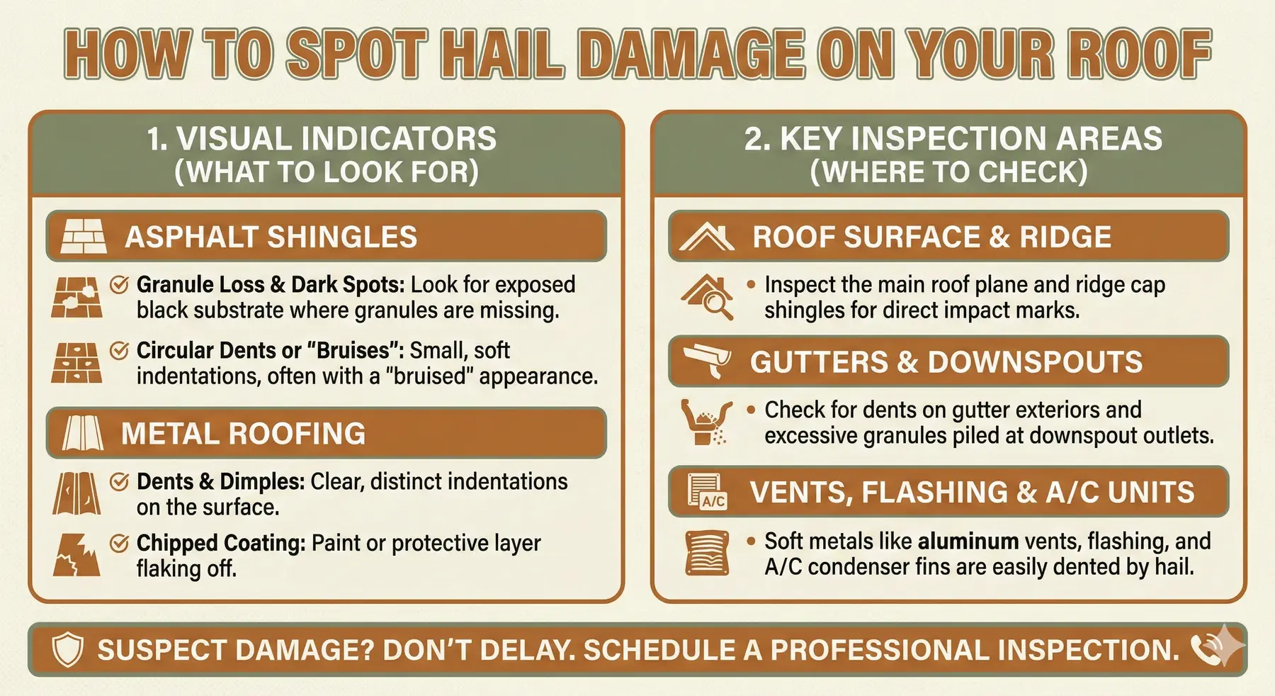 Hail damage isn’t always obvious to the untrained eye. Homeowners should watch for these warning signs: