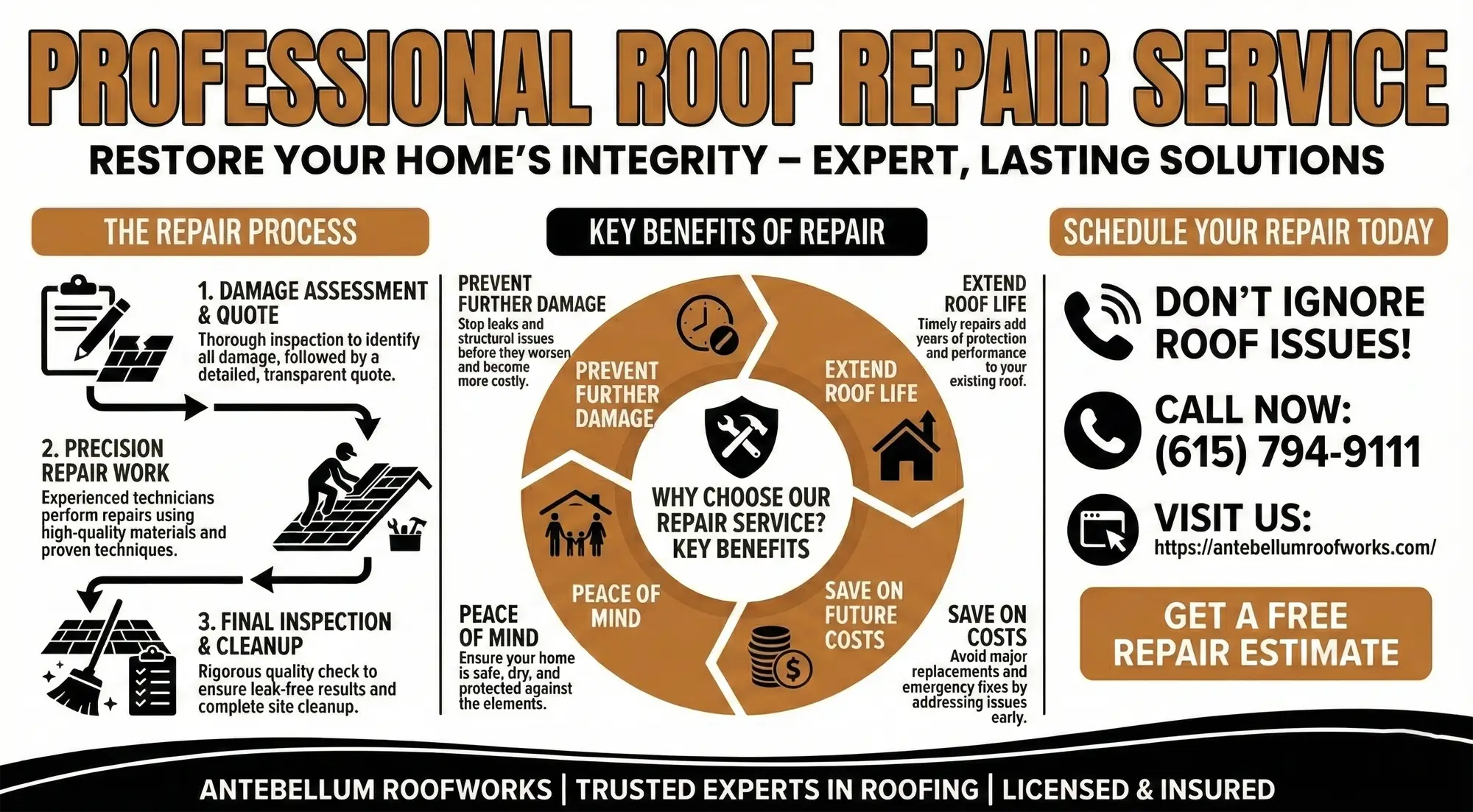 In Middle Tennessee, roof inspections typically range from $150–$400 depending on the size and complexity of the roof. However, Antebellum Roofworks offers free residential roof inspections with no obligation. We want to empower homeowners with the knowledge to make informed decisions.