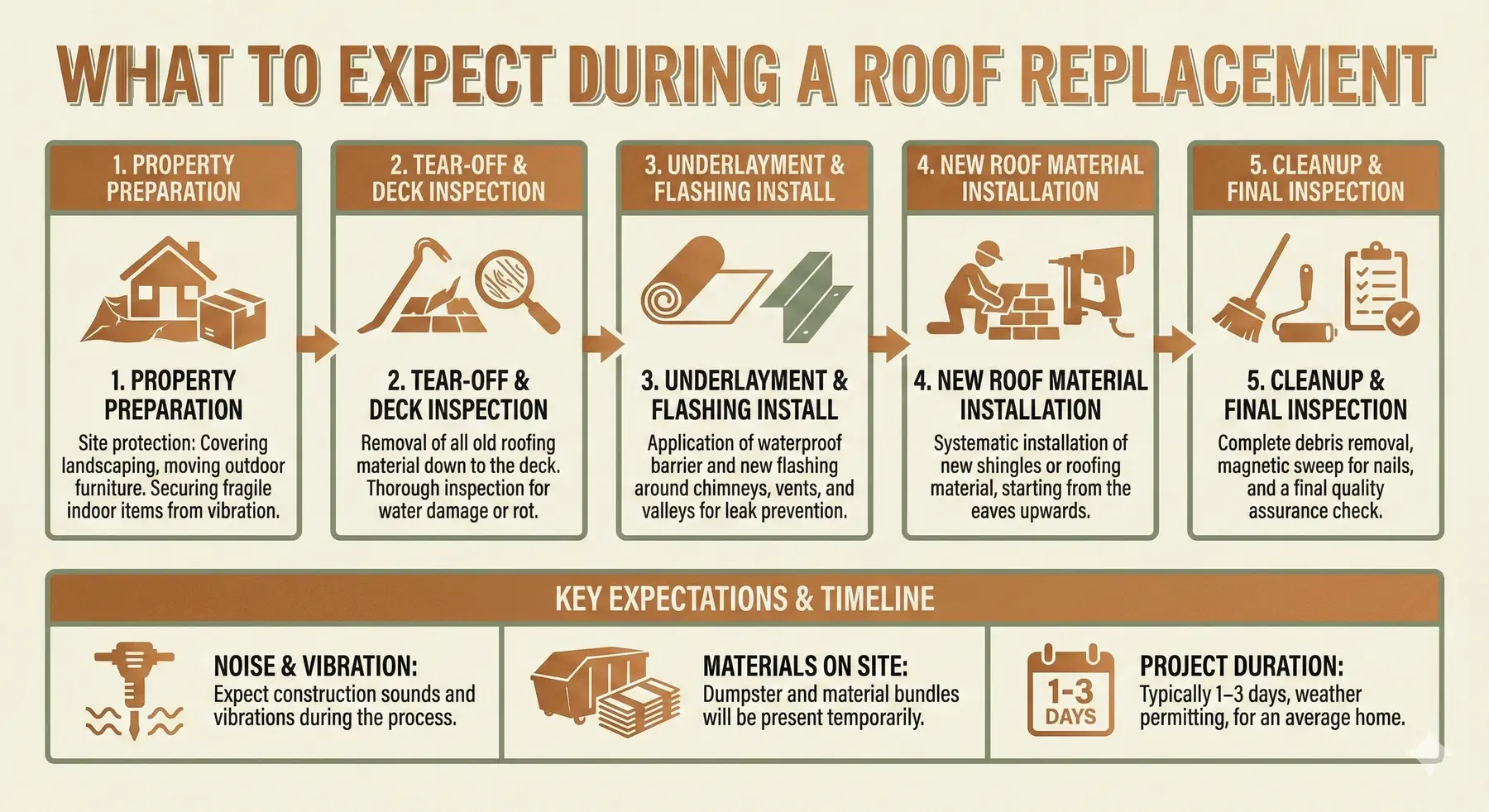 Most residential roof replacements are completed within 1–3 days, depending on the size and complexity of the roof. We work efficiently to minimize disruption to your routine.